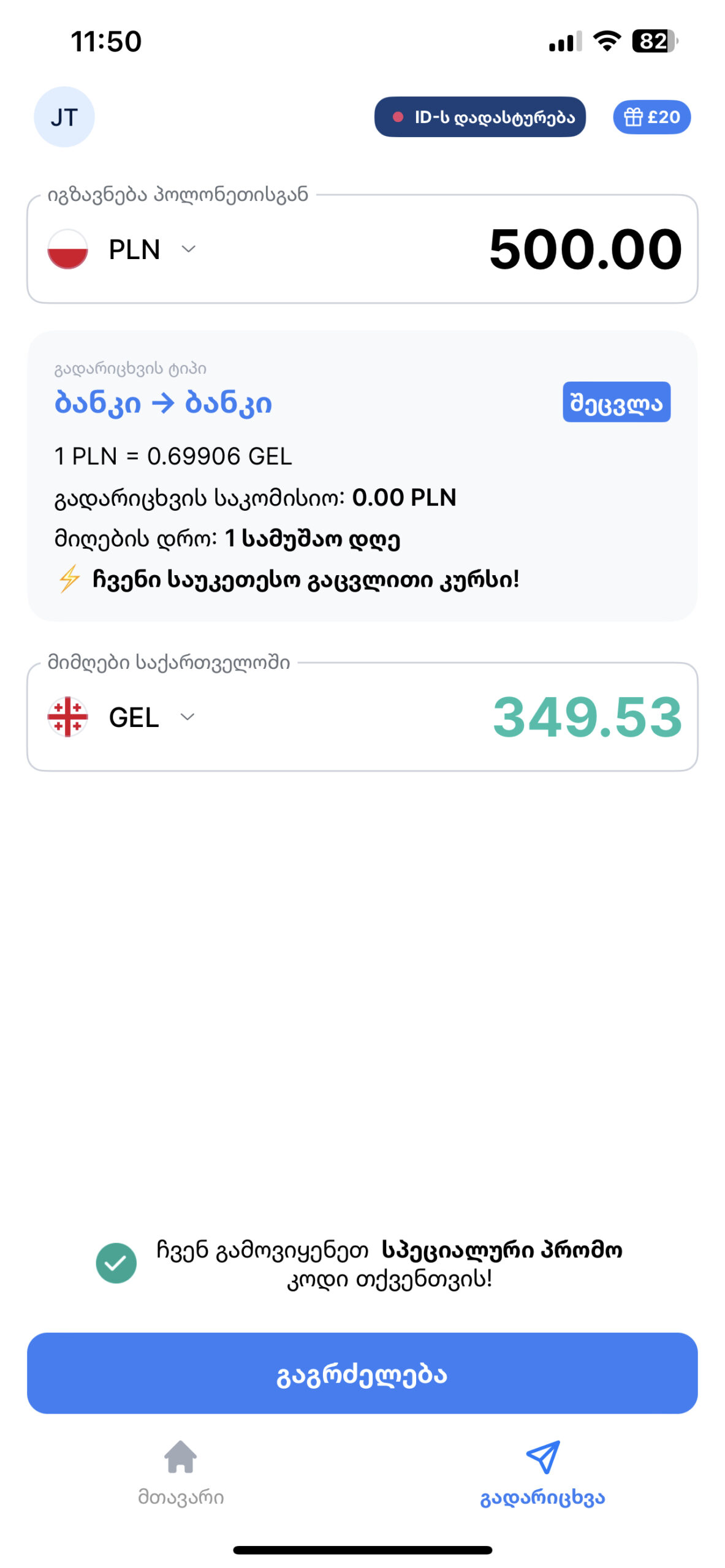 თუ აკეთებთ საბანკო გადარიცხვას, გააკეთეთ შეკვეთა TransferGo-ს აპლიკაციაში, შემდეგ გამოიყენეთ თქვენი საბანკო აპლიკაცია TransferGo-თი ფულის გასაგზავნად — გამოიყენეთ ის საბანკო დეტალები, რომლებიც მათ გამოგიგზავნეს. ამის შემდეგ, აცნობეთ TransferGo-ს აპლიკაციის საშუალებით და ისინი ფულს თქვენს მიმღებს ცენტრალურ აზიაში გაუზავნიან.